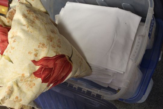 TWO PLASTIC LIDDED BOXES OF LINEN