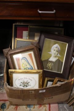 A LARGE BOX OF ASSORTED PICTURES AND PRINTS TO INCLUDE OAK FRAMED EXAMPLES