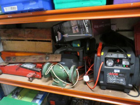 A QUANTITY OF ELECTRIC GARDEN TOOLS ETC TO INCLUDE A HEDGE TRIMMER, TROLLEY JACK, BENCH GRINDER ETC