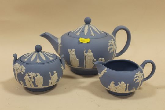 A WEDGWOOD BLUE JASPERWARE THREE PIECE TEA SERVICE
