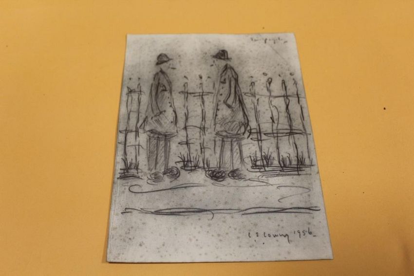 CIRCLE OF LAWRENCE STEPHEN LOWERY 1887 - 1976 - A STUDY OF TWO MEN BY RAILINGS, BEARS SIGNATURE AND DATE 1956 LOWER RIGHT
