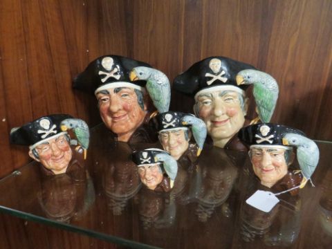 TWO MEDIUM ROYAL DOULTON CHARACTER JUGS - LONG JOHN SILVER, both D6386 but one large than the other, tallest 10.5 cm, THREE GRADUATING ROYAL DOULTON CHARACTER JUGS - LONG JOHN SILVER, consisting of small D6512, medium and large D6335, H 19 cm AND LARGE ROYAL DOULTON CHARACTER JUG - LONG JOHN SILVER D6335, H 19 cm (6)