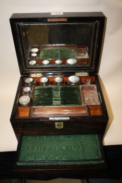 A VICTORIAN COROMANDEL LADIES VANITY BOX WITH FITTED INTERIOR, HAVING VANITY JARS WITH HALLMARKED SILVER LIDS LONDON 1861
