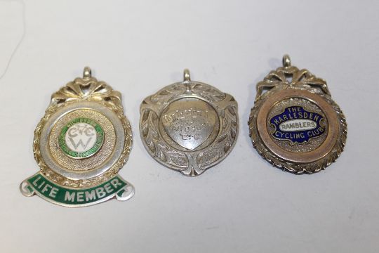 THREE HALLMARKED SILVER CYCLING INTEREST FOB MEDALS