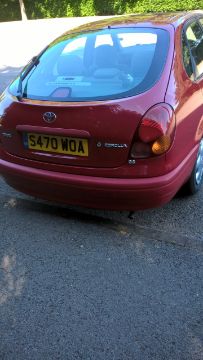 A 1999 RED TOYOTA COROLLA GS 1.6 PETROL - S470 WOA - KEYS AND LOG BOOK, APPROX 33500 MILES, MOT 3RD DEC 2020