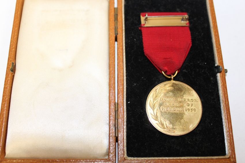 A HALLMARKED 9 CT GOLD DAILY MIRROR AWARD OF HONOUR 1959 MEDAL, in fitted case embossed in gold lettering 'H.G.Metcalfe', approx weight 21g, Dia 3.5 cm