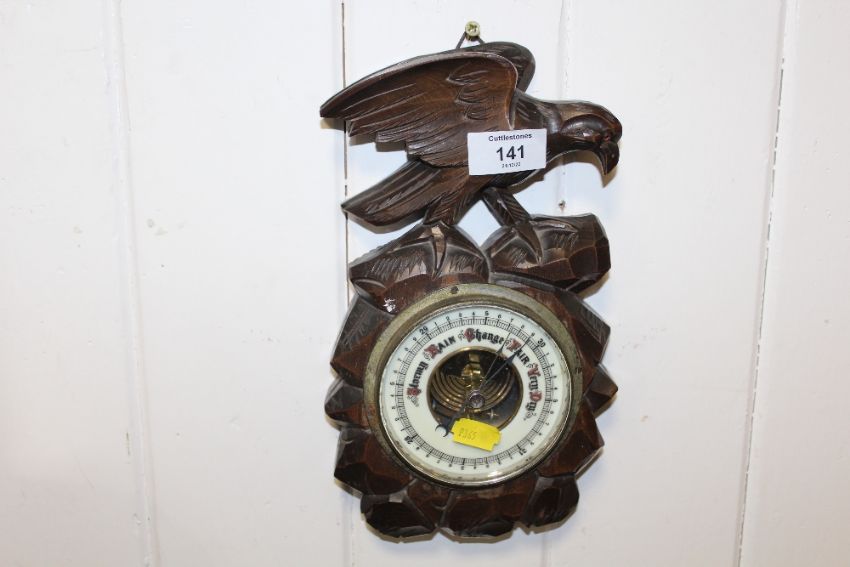 A CARVED BLACK FOREST STYLE BAROMETER WITH BIRD FINIAL TO TOP
