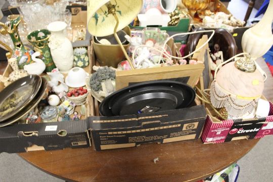 THREE TRAYS OF ASSORTED CERAMICS TABLE LAMPS, WOODEN FIGURES ETC.