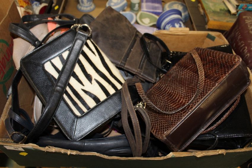 A TRAY OF LADIES LEATHER AND OTHER HANDBAGS ETC.