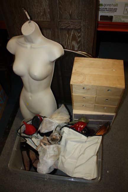 A BOX OF MOSTLY MODERN LADIES SHOES, TOGETHER WITH A COAT HANGER MANNEQUIN BODY, SMALL DRAWERS CONTAINING COTTONS FIRE GUARD ETC.