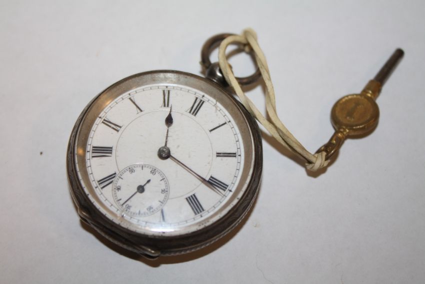 A SMALL ANTIQUE SILVER POCKET WATCH WITH KEY