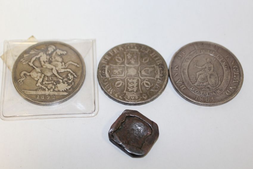 A GEORGE III 1804 FIVE SHILLING DOLLAR, TOGETHER WITH AN 1892 SILVER CROWN, 1677 CHARLES II EXAMPLE AND ANOTHER (4)