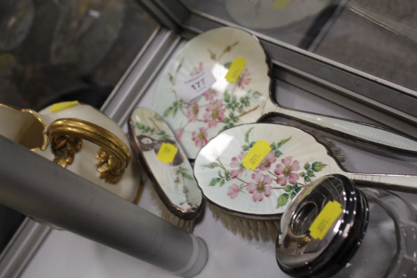 A ROYAL WORCESTER BLUSH IVORY JUG A/F TOGETHER WITH A COLLECTION OF ENAMELLED DRESSING TABLE ITEMS A/F