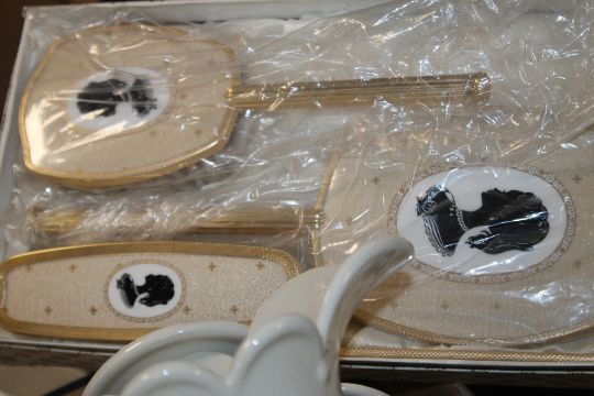 A BOX CONTAINING LLADRO PIGS ORNAMENT, TWO JUG & BOWL SETS, LARGE PINK PLANTER & SAUCER & VINTAGE BOXED HAIRBRUSH / MIRROR SET