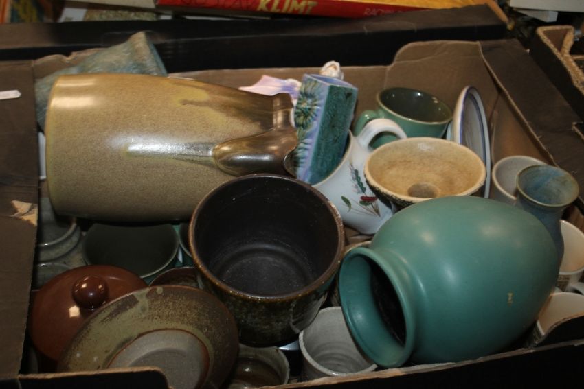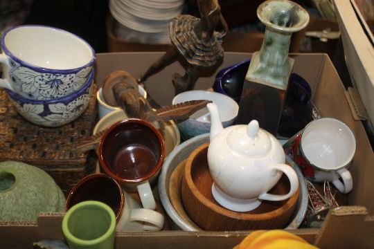 FOUR TRAYS OF CERAMICS ETC. TO INCLUDE DENBY (TRAYS NOT INCLUDED)