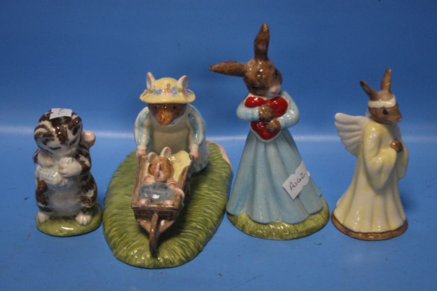 THREE ROYAL DOULTON AND ONE BESWICK FIGURE TO INCLUDE 'MISS MOPPET', 'ANGEL BUNNYKINS', 'LOVEHEART BUNNYKINS' AND 'HEADING HOME' (4)