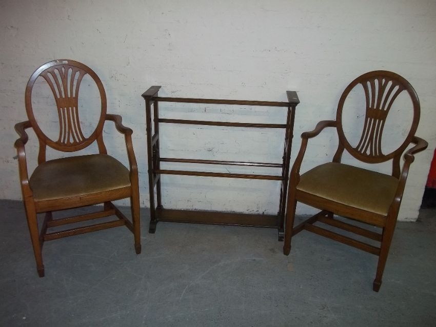 TWO ANTIQUE OAK CARVER CHAIRS AND AN EDWARDIAN TOWEL RAIL A/F