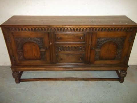A HEAVY CARVED SOLID OAK SIDEBOARD WITH PINEAPPLE STYLE LEGS, L 168 cm, D 45 cm, H 91 cm