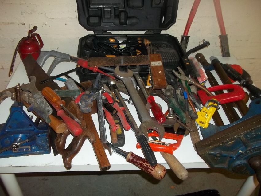 A SELECTION OF TOOLS, A MACALLISTER CORDLESS DRILL AND A WOODEN TOOL BOX