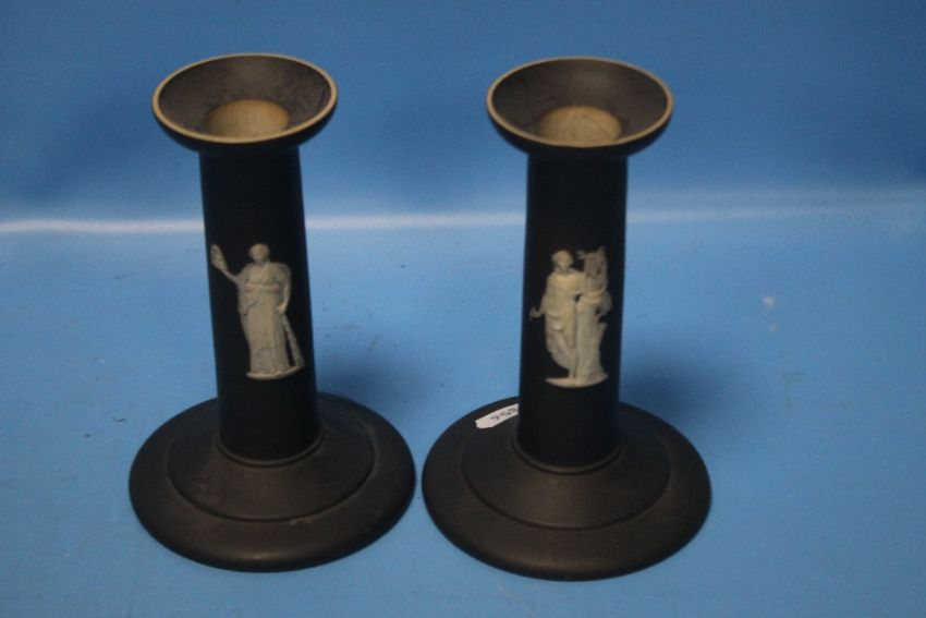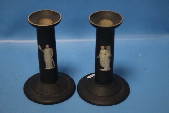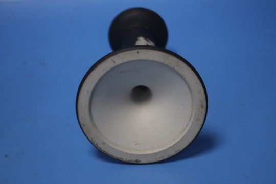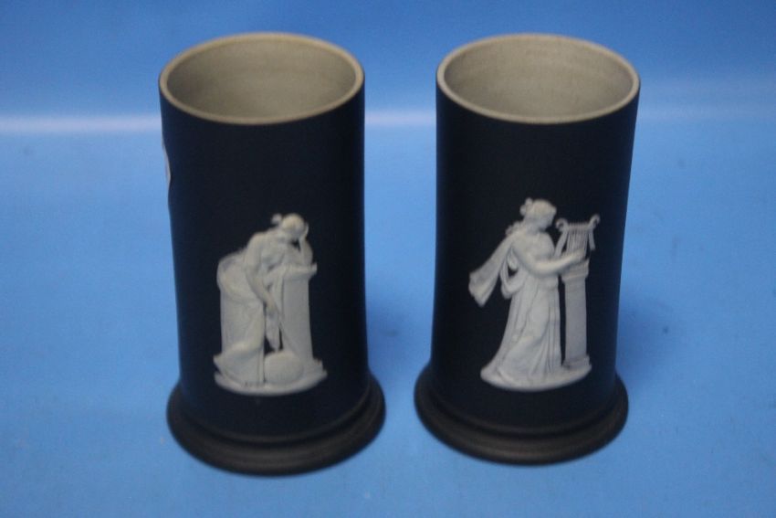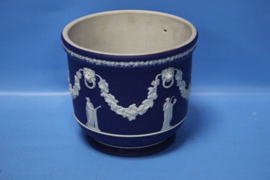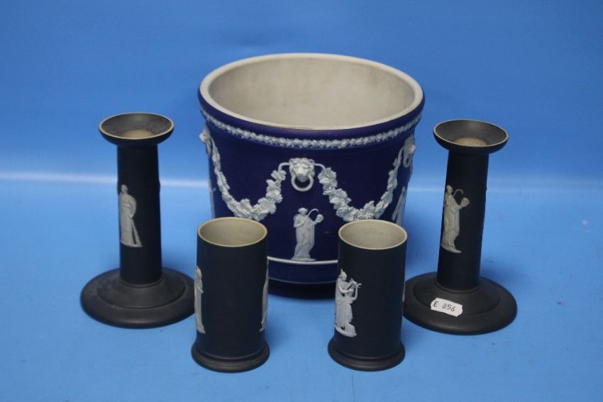 A COLLECTION OF WEDGWOOD JASPERWARE MAINLY BLACKCondition Report: The jardiniere is a darker blue. It has an old rust stain to the inside bottom, light surface scratches, a chip to the foot rim and small flea bit chips to the base and rim. H 16 cmThe black pieces are in good condition with no damages we can find.