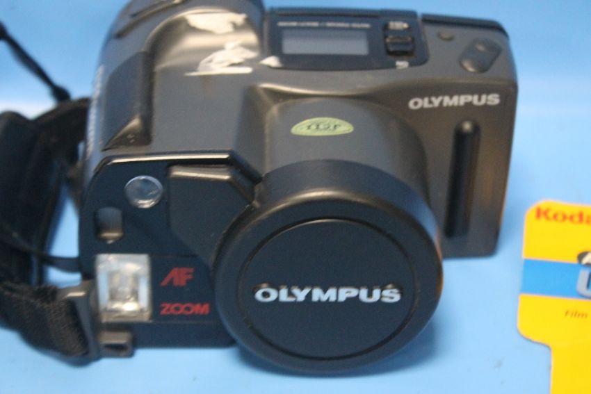 AN OLYMPUS AZ-300 SUPER ZOOM CAMERA IN CASE WITH A NEW FILM