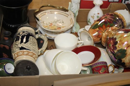 THREE TRAYS OF CERAMICS AND GLASSWARE ETC. TO INCLUDE DECANTERS (TRAYS NOT INCLUDED)