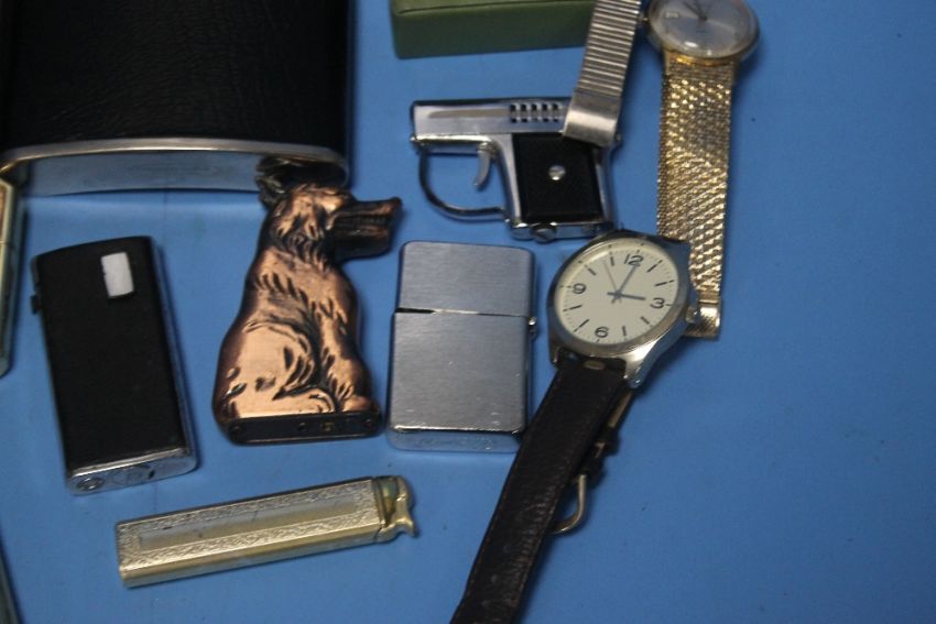 A TRAY OF COLLECTABLES TO INCLUDE LIGHTER, WRIST WATCHES ETC. (TRAY NOT INCLUDED)