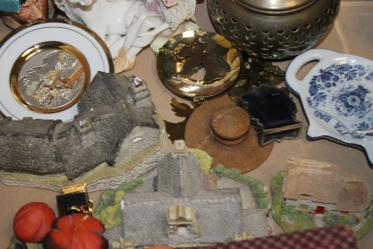 TWO TRAYS OF CERAMICS AND SUNDRIES TO INCLUDE DAVID WINTER COTTAGES, MEAT PLATE ETC. (TRAYS NOT INCLUDED)