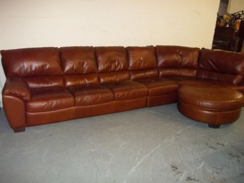 A BROWN LEATHER CORNER SOFA AND POUFFE