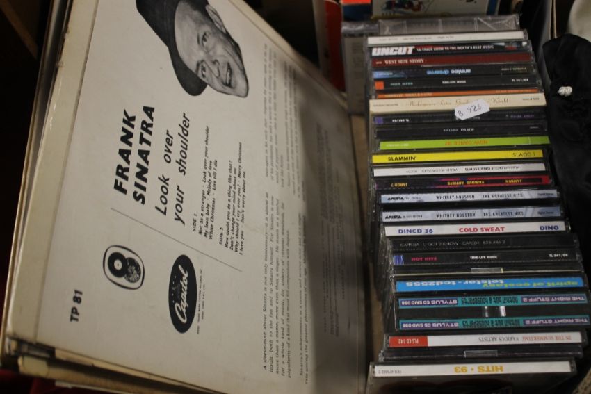 A TRAY OF ASSORTED CAMERAS AND A COLLECTION OF CDS AND RECORDS