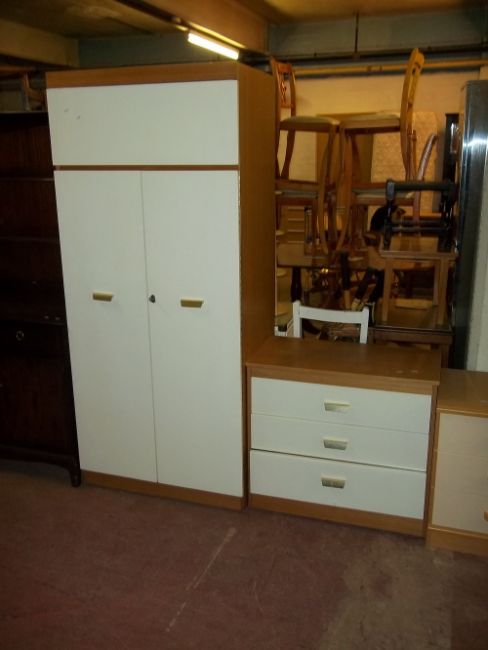 A TWO PIECE MODERN BEDROOM SUITE COMPRISING A WARDROBE AND THREE DRAWER CHEST