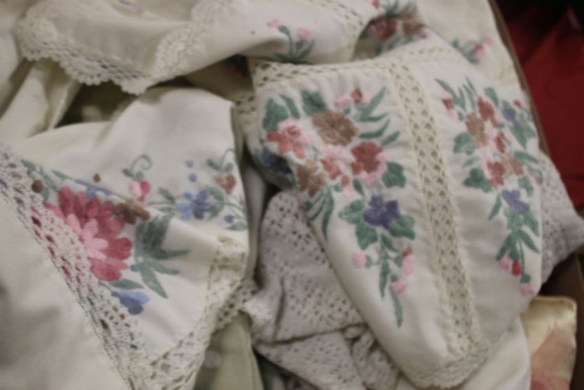 A TRAY OF LINEN INCLUDING EMBROIDERY