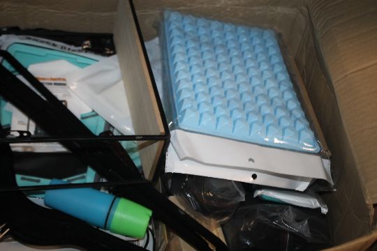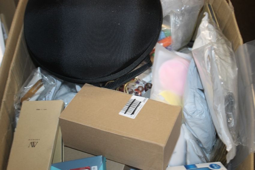 FOUR BOXES OF MAINLY NEW ITEMS TO INCLUDE ICE CUBE TRAYS, PHONE CASES, COAT HANGERS ETC.