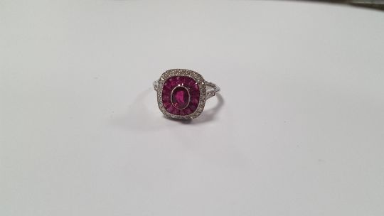 A PLATINUM RING SET WITH CENTRAL RUBY A HALO OF CALIBRE-CUT RUBIES AND A HALO OF DIAMONDS, SIZE L½