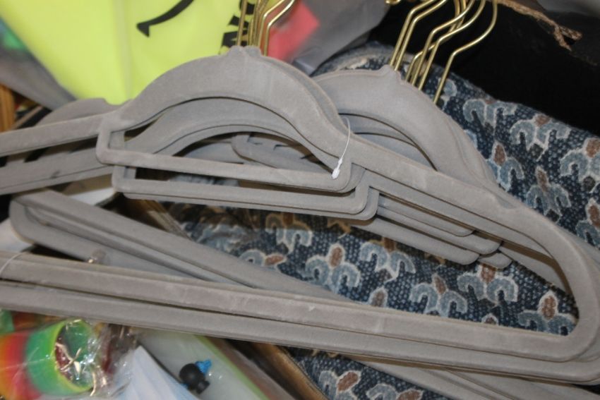 A SMALL TRAY OF COAT HANGERS, RUG ETC.
