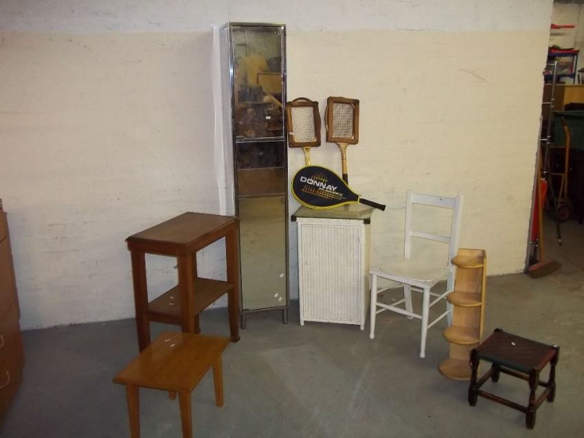 A SELECTION OF TEN ITEMS TO INCLUDE: TABLES, LOOM BASKET AND A FLOOR STANDING STAINLESS STEEL BATHROOM CABINET