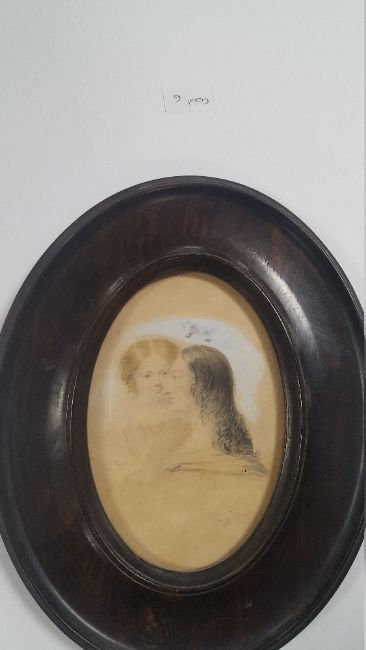 A GEORGIAN MINIATURE PORTRAIT OF A LADY AND CHILDThe portrait appears to be pencil with watercolour highlights, painted on card.  The card has aged with light staining otherwise good general condition