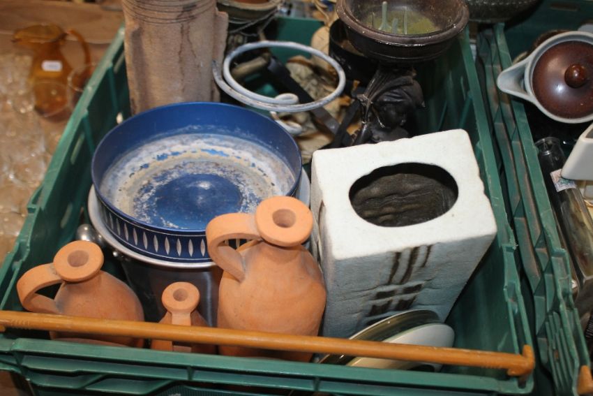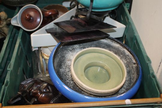 TWO TRAYS OF CERAMICS AND SUNDRIES TO INCLUDE DENBY (TRAYS NOT INCLUDED)