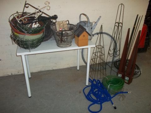 A QUANTITY OF GARDEN AND PET ITEMS TO INCLUDE THREE PET / DOG CAGES, STORAGE BINS WITH LIDS, HANGING BASKETS, AN INCINERATOR ETC.