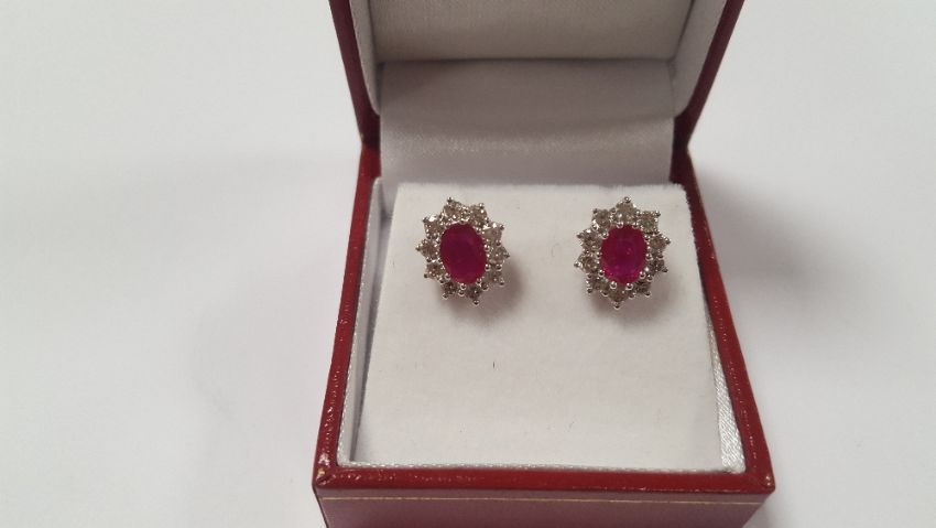 A PAIR OF 18 CT WHITE GOLD RUBY AND DIAMOND CLUSTER STUDS, RUBIES APPROX. 1.9 CT, DIAMONDS APPROX. 1 CT, BOXED