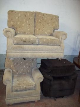 A TWO PIECE SUITE COMPRISING TWO SEATER SOFA AND A CHAIR TOGETHER WITH A BROWN RECLINER CHAIR