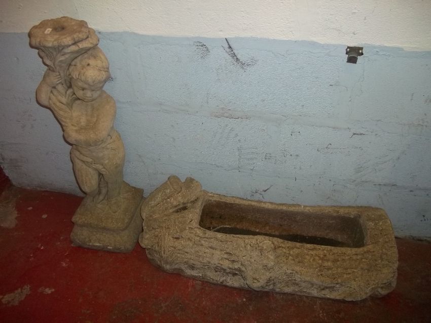 A DECORATIVE PLANT TROUGH AND A STATUE IN CONCRETE