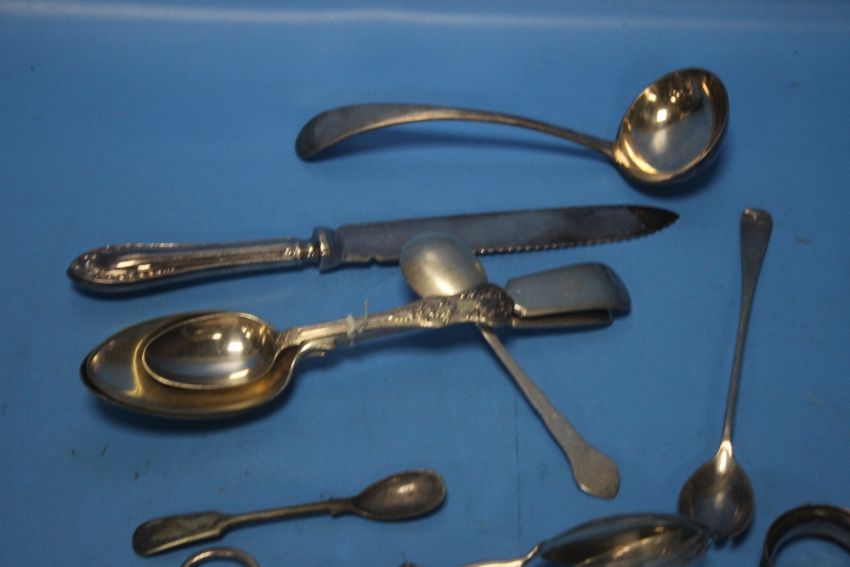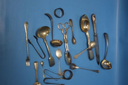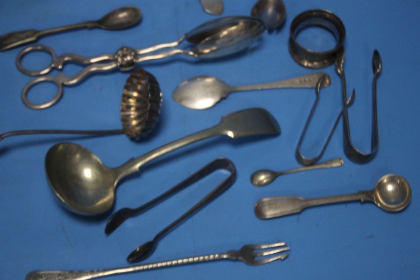 A QUANTITY OF WHITE METAL ITEMS TO INCLUDE SPOONS, TONGS ETC.