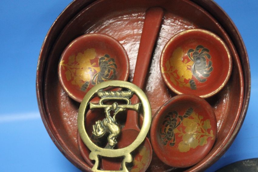 A PAPIER MACHE ORIENTAL SET TOGETHER WITH A CLOCK BACK, HORSE BRASSES ETC.