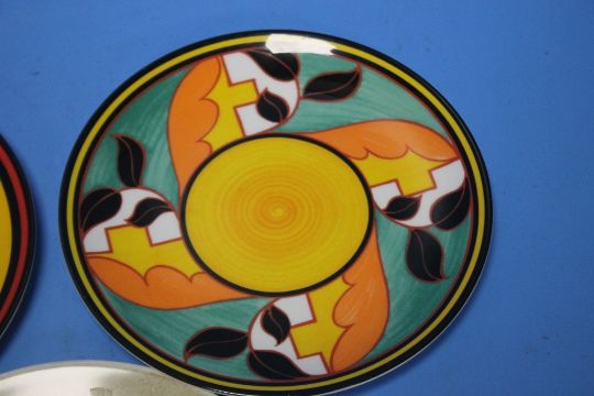 THREE PLATES TO INCLUDE CLARICE CLIFF WEDGWOOD 'BLUE LUZERNE' IN 'THE BIZARRE WORLD OF CLARICE CLIFF', WEDGWOOD 'FLAMBOYANCE' AND A HAND PAINTED SCENIC PLATE (3)