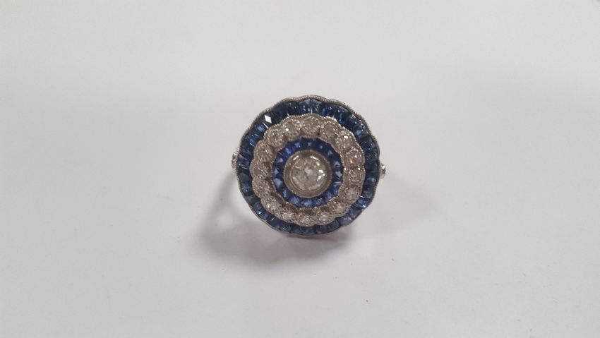 A PLATINUM SAPPHIRE AND DIAMOND RING, DIAMONDS APPROX. 0.78 CT, CALIBRE CUT SAPPHIRES APPROX. 2.35 CT, SIZE O½