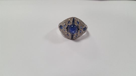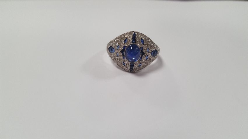 AN ART DECO-STYLE PLATINUM DRESS RING SET WITH A CENTRAL CABOCHON SAPPHIRE AND FURTHER DIAMONDS AND SAPPHIRES, SIZE O
