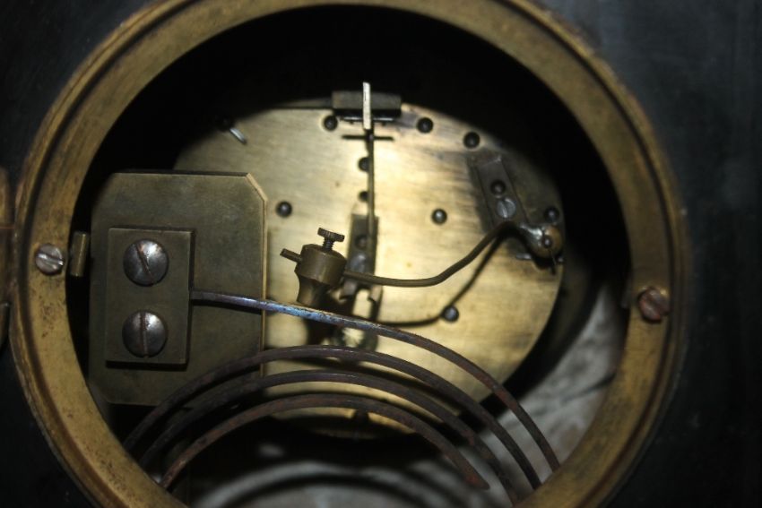 A SLATE MANTEL CLOCKCondition Report:  The pendulum is present and the key.  The case has minor edge chips but no cracks we can find. The clock strikes on a gong. H 27 cm. When would the right hand goes around with no traction. The left is fully wound and stuck.