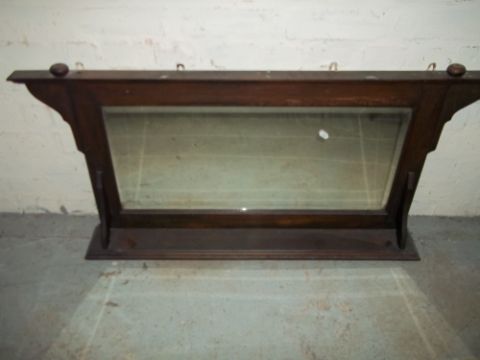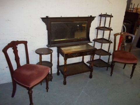A COLLECTION OF ITEMS COMPRISING A WOTNOT, AN OVERMANTLE MIRROR, TWO ANTIQUE CHAIRS AND AN OAK TABLE ETC. (6)