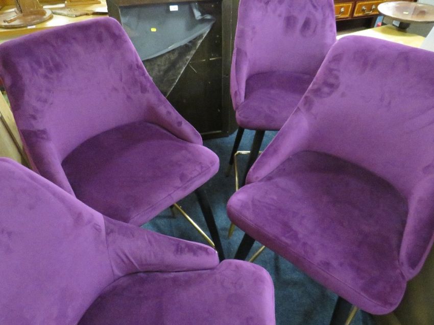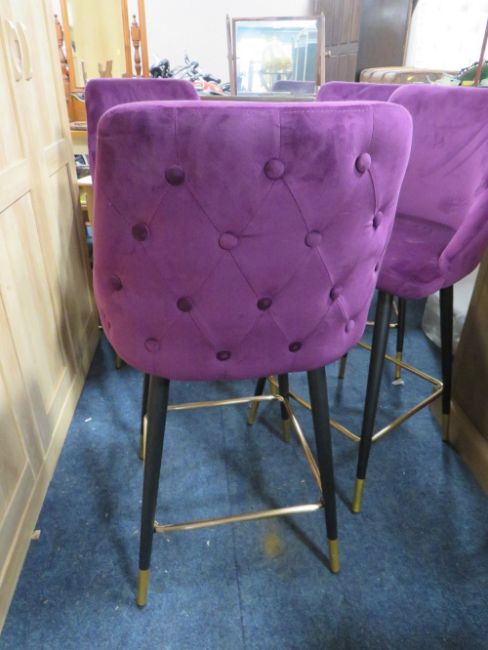 A SET OF FOUR MODERN PURPLE UPHOLSTERED BAR STOOLS